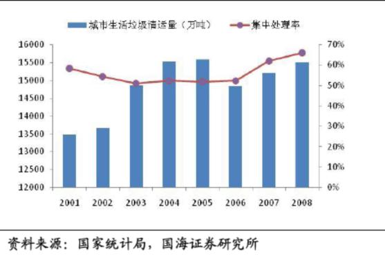 In recent years, China's living garbage QingYunLiang maintained at about 150 million tons. Mainly handling waste sanitary landfill, composting, incineration and etc. In 2007 the national life garbage disposal facilities, a total of 460, including 366 sanitary landfill, composting, 17, 66 waste incineration. 3 years to 7 years, the number of landfill plant is on the decline, reduced from 575 to 575. The number of composting plant reduced from 70 to 17; The incinerator is increased from 47 to 66. Waste incineration will gradually become the mainstream of life garbage disposal methods. China's environmental governance investment can be divided into three main directions: the urban environmental infrastructure investment, industrial pollution, the "three simultaneity" construction projects environmental protection investment, the proportion of roughly 4:2:4. In the urban environmental infrastructure investment, solid waste management of investment accounted for 4%; In the industrial pollution control investment, investment accounted for 6% of solid waste treatment; In the "three simultaneity" investment, solid waste management investment accounted for 8%. The solid waste treatment in the environmental governance investment accounted for about 6%. With the growing of urban garbage problem, however, some experts based on the data to predict 03-7 years, solid waste disposal proportion of investment in environmental governance structure will be increased from 6% to 6%. Benefit from "restructuring" the economic development of the main tone of the solid waste industry into the golden development. During the period of "11th five-year plan", the scale of investment in solid waste treatment of 210 billion, an average annual growth rate of 18.5%, and the environmental protection of China environmental sarft to predict "twelfth five-year" period, the solid waste industry reached 800 billion, compared with the 11th five-year plan, quadrupling the solid waste industry into the golden development for 10 years. During the period of our country's environmental protection industry began in the seventh ", along with the rapid growth of the national economy, China's environmental protection investment continues to high-speed growth. In accordance with the plan, during the period of "twelfth five-year" China environmental protection investment will reach 3.1 trillion, 1.54 trillion during the period of "11th five-year plan" of investment rose 121%, the average annual growth rate of 24.2%, the increase of environmental protection investment promote the high-speed development of the industry. China's environmental protection investment as a share of GDP from 1.01% in 2001 to 1.43% in 2008, the level of environmental protection industry level in the 80 s, with the United States, the stage for the environmental protection industry during the second half of the high speed development, environmental protection of growth is about twice GDP growth, thus, if China's 8% GDP growth, environmental protection investment/GDP to 2.5% in 2015, is China's environmental protection investment will reach 1.35 trillion, 2015, 2008-2015 annual compound growth rate to 16.97%. During the period of "11th five-year plan", the scale of investment in China's solid waste treatment of 210 billion, an average annual growth rate of 18.5%, the garbage disposal to 25% growth in environmental protection investment, but the solid waste disposal problem is still deteriorating, so the scale of investment in China's solid waste treatment need to continue to increase in order to curb the trend. As one of the most important aspects of the environmental protection industry, compared with the sewage treatment and atmosphere, China's current solid waste treatment industry is still at the initial stage, the degree of industrialization and market concentration is very low, with the rapid increase of investment scale, solid waste treatment industry also will be rapid development. Renowned institutions EBJ environmental protection industry development was divided into four stages: the preliminary stage of development, the environmental protection infrastructure market stage of development, strengthening the regulation stage and mature period. China is now in the second stage, the environmental protection infrastructure development stage. At present China's environmental protection the main driving factors of heavy industrialization, urbanization and high pollution caused by the environmental protection requirements. Solid waste treatment industry is one of the main sector of environmental protection industry, is refers to provide a range of products and services to measure, to prevent, restrict and weaken the various problems caused by solid waste industry. Solid waste can be divided into industrial solid waste, waste and hazardous waste, while the latter is the number of proportion is very small. Between 2001 and 2009, the discharge of industrial solid waste from about 900 million tons of surge to about 2.1 billion tons, the average annual compound growth rate of 12%. Due to the discharge of waste hard statistics bureau data are given in general use garbage QingYunLiang indicators instead. Living garbage of actual quantity about QingYunLiang twice, and removed than rising trend year by year. From 2001 to 2008, urban waste output compound growth rate of 5%, and the garbage QingYunLiang growth was only 2.03%, as a whole, the trash pickup as fast as the speed of the waste, garbage siege phenomenon appears, garbage disposal problem has caused people and the government attaches great importance to. By 2007, our country of untreated urban domestic waste accumulated amount has reached more than 70, one hundred million tons, occupy land area of more than 500 million square meters, about 200 cities in the country's 660 city surrounded by rubbish. Shenzhen innovation investment group co., LTD Solid waste disposal industry starts late in our country. The present compe